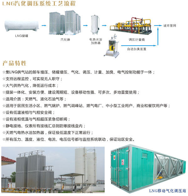 LNG汽化調壓係統由撬裝式LNG供氣終端和LNG儲罐組成。LNG供氣終端包括:LNG卸車係統、氣化調壓計量加臭係統。供氣站控製係統等組成,工藝流程如下圖所示。LNG低溫槽車運來的LNG液體,通過液相進口管進入LNG儲罐,低溫儲罐出來LNG液體經過汽化器氣化後,進入調壓計量係統進行壓力調節與流量計量,經加臭進入城市管網,輸送至用戶。