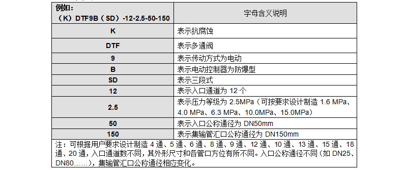 1. 產品簡介 1.1用途 DTF9B係列電動多通閥是用於油田計量站, 油you氣qi集ji輸shu及ji單dan井jing油you氣qi計ji量liang選xuan井jing控kong製zhi用yong的de一yi種zhong特te種zhong電dian動dong閥fa。它ta代dai替ti了le老lao式shi計ji量liang站zhan中zhong的de管guan彙hui及ji電dian動dong三san通tong球qiu閥fa閥fa組zu,既ji適shi用yong於yu稀xi油you介jie質zhi,也ye適shi用yong於yu稠chou油you介jie質zhi。它ta與yu計ji量liang站zhan上shang的de計ji量liang裝zhuang置zhi配pei套tao工gong作zuo,可ke實shi現xian計ji量liang站zhan遠yuan程cheng或huo就jiu地di“自動倒井、自動計量”。 1.2優越性 一yi台tai多duo通tong閥fa代dai替ti了le計ji量liang站zhan中zhong十shi多duo台tai計ji量liang倒dao井jing用yong的de電dian動dong三san通tong球qiu閥fa及ji管guan彙hui,簡jian化hua了le工gong藝yi流liu程cheng,節jie省sheng了le設she備bei投tou資zi,減jian少shao了le設she備bei維wei護hu工gong作zuo量liang,減jian少shao了le基ji建jian麵mian積ji,節jie省sheng了le大da量liang的de人ren力li、物力資源。 針對稠油介質含砂量大,對閥衝刷和磨損加重並使閥密封壽命縮短的特點,我公司在結構和製造過程中采用了多項新技術、新工藝,使得困擾多年的稠油介質很難密封的問題得到了解決,使該產品具有了耐磨損、耐腐蝕、密封可靠、壽命長、操作簡便等優點。 1.3操作方式 DTF9B係列多通閥共有三種方式:即手動操作方式、就地遙控器操作方式、控製室遠程操作方式。 手動操作:通過電動控製器上的手輪及閥軸上的指針和閥體上的刻度盤進行操作,這種操作方式僅用於停電時的操作。 就地遙控器操作:在電動控製器有電時,用隨機附帶的遙控器在“就地”操作狀態下進行操作。 控製室遠程操作:在電動控製器有電時,用隨機附帶的遙控器進入“遠程”操作狀態,此時,電動控製器隨時接收控製室上位機發出的控製信號,根據控製信號自動選井定位。 2. 型號說明