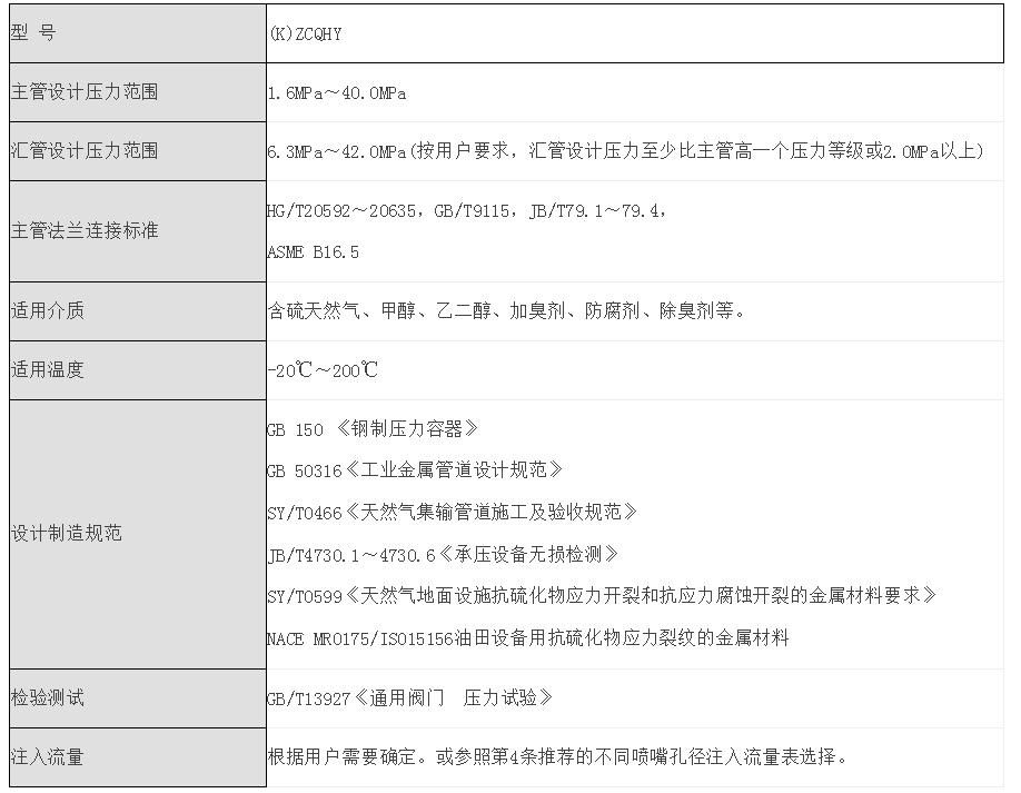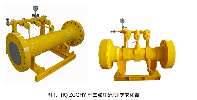 (K)ZCQHY係列注醇(加藥)霧wu化hua裝zhuang置zhi能neng有you效xiao使shi注zhu入ru的de防fang凍dong液ye和he水shui化hua物wu抑yi製zhi劑ji等deng液ye體ti化hua學xue物wu質zhi充chong分fen霧wu化hua,與yu天tian然ran氣qi及ji石shi油you均jun勻yun混hun合he,能neng有you效xiao的de防fang止zhi冰bing堵du和he抑yi製zhi水shui化hua物wu的de生sheng成cheng。注zhu入ru閥fa采cai用yong獨du特te的de旋xuan流liu型xing霧wu化hua噴pen嘴zui(中國授權專利:ZL201120154703.1),設置起旋葉片和渦流室,結構緊湊,易於在線更換。噴嘴為硬質合金材料,特殊工藝製成,耐腐蝕、耐衝刷,使用壽命長。完全解決了傳統針型結構的注醇閥在操作過程中,霧化效果差, 液滴不均勻, 工作壓力高, 管線壓損和注醇閥磨損大等問題。本裝置主要用於石油、天然氣管道或容器注入甲醇、乙二醇等化學物質,也可用於其它各種液體需要霧化的場合,如:加入消泡劑、除臭劑、防腐劑、加臭劑 等。該產品廣泛用於石油、天然氣、化工、電力、環保、食品、醫藥、輕紡、軍工等行業。