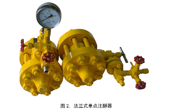 6.主要結構 (詳見圖3) 6.1 設計合理,結構緊湊。整個注醇/加藥裝置設計成撬裝結構,由主管組件、彙管組件、高密封法蘭截止閥、注入閥、取樣截止閥、壓ya力li表biao及ji連lian接jie管guan路lu組zu成cheng。天tian然ran氣qi工gong藝yi管guan道dao與yu本ben裝zhuang置zhi的de主zhu管guan法fa蘭lan相xiang連lian,藥yao劑ji加jia注zhu管guan路lu與yu本ben裝zhuang置zhi中zhong的de進jin液ye接jie管guan相xiang焊han。連lian接jie簡jian單dan,免mian去qu了le現xian場chang組zu裝zhuang閥fa門men、組焊管路的麻煩,節省了大量人力、物力資源,降低了生產成本。 6.2帶遠傳接口裝置(按用戶要求)。在彙管組件上組焊一接頭,加裝一隻角式高密封內螺紋排泄截止閥(或角式高密封內外螺紋排泄截止閥),該閥接口為NPT1/2″內螺紋,可與壓力變送器相連,以實現壓力等參數遠程傳輸要求。 6.3zhurufacaiyongxinxingxuanliushipenzuijiegousheji,bingqileyuanzhenxingfazhipenshijiegoucunzaidebuzu。penwukelixixiaoqiefeichangjunyun,wuhuayachaxiao,wuhuaxiaolvgao,zhuruyachaxiao,tigaolezhuchunbengdeshiyongshouming,jianshaolezhuruliangdelangfei。penwujiajiao40~60°,利於注入劑與天然氣的充分霧化,比傳統的針型閥直噴式調節霧化效果更顯著。 7.產品安裝結構圖