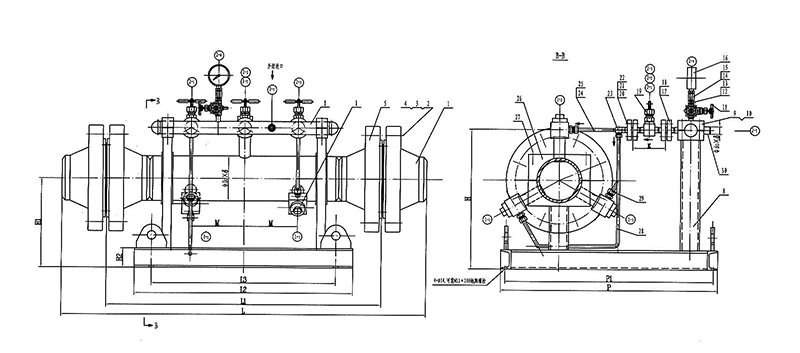 圖3. (K)ZCQHY型注醇/加藥霧化器安裝結構圖 1、對焊法蘭 2、雙頭螺柱 3、螺母 4、八角環墊(或纏繞式墊片) 5、霧化器主管 6、注入閥 7、注醇彙管 8、支撐座 9、壓蓋 10、內六角螺釘 11、取樣截止閥 12、正反絲接頭 13、墊片 14、正反絲螺母 15、墊片 16、壓力表 17、螺紋法蘭 18、透鏡墊 19、高密封法蘭截止閥 20、雙頭螺柱 21、螺母 22、平墊圈 23、角式接頭 24、直通連接管組件 25、O形圈 26、壓蓋 27、內六角螺釘 28、角式連接管組件一 29、角式連接管組件二 30、進液接口